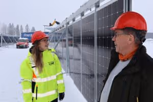 – Gjennom ecoINSIDE-prosjektet vil denne solparken gi ny kunnskap til utviklingen av solenergiproduksjonen både i Sverige og Norge, forteller Ola Rostad til ROAFs Anne HertzenbergDet EU-finansierte prosjektet ecoINSIDE i Interreg Sverige-Norge-programmet har vært viktig som tilrettelegger for realiseringen av solenergiparken.Scatec Solar har levert selve anlegget som er basert på selskapets fleksible system – «Release». Slike anlegg leveres oppsettingsklare i containere og installeres mye raskere enn tradisjonelle solcelleanlegg.– Det har stor verdi for oss å få testet ut teknologien under ulike klimatiske forhold og se på hvilken effekt refleksjonen fra snøen vil ha. Vi ser frem til å bidra til å vise at solenergi er en teknologi som også fungerer godt i Norge, sier Senior Vice President for Venture Projects i Scatec, Frederic Grosse.Et pionéranleggSolenergiklyngens daglige leder Trine Kopstad Berentsen er stolt over at det nå etablereres et slikt anlegg her til lands.– Dette er virkelig «state of the art». Det er første gang man tester ut denne løsningen i Norge, sier Berentsen.Det faktum at anlegget er flyttbart gjør at det i fremtiden kan plasseres på et ferdig deponi, slik at det ikke beslaglegges potensiell matjord, påpeker hun.Fornybart avfallssorteringsanleggNår det nye anlegget er i drift vil ROAF være selvforsynt med omtrent en fjerdedel av sitt totale energiforbruk, forteller miljødirektør, Glenn V. Lie Karlsen.Solenergiklyngens Ola Rostad (t.v.) og ROAFs Glenn V. Lie Karlsen er imponert over hvor fort Leif Skorge og Scatec-montørene klarer å sette opp det fleksible solcellesystemet – «Release».– I fjor installerte vi et solcelleanlegg på taket av ettersorteringsanlegget vårt. Med den nye solcelleparken i drift, vil de to anleggene produsere én gigawattime i året.Det er det samme som 1 million kWh – og tilsvarer årsforbruket til 50 eneboliger.Mange støttespillereSolcelleparken har fått økonomisk bidrag fra Enova. Seniorrådgiver Frode Olav Gjerstad forteller at Enova støtter innovative teknologiprosjekter som bidrar til å styrke energisystemet og gir klimagassreduksjon.– ROAF har lagt stor vekt på at erfaringene fra byggingen og driften skal deles med forskingsmiljøer, Solenergiklyngen og andre markedsaktører, påpeker Gjerstad.Solenergiklyngen fikk støtte fra Regionalt innovasjonsprogram for Oslo kommune og Akershus fylkeskommune for å kartlegge muligheten for å sette opp en slik solpark på Romerike. Prosjektet «Seeing is believing» knyttet til seg Scatec Solar, Akershus Energi, IFE, Eltek, REC Solar Norway, Multiconsult, Solenergi FUSen, Solcellespesialisten, Smartgridssenteret i Trondheim, og Innos/Glava Energy Center i Arvika.