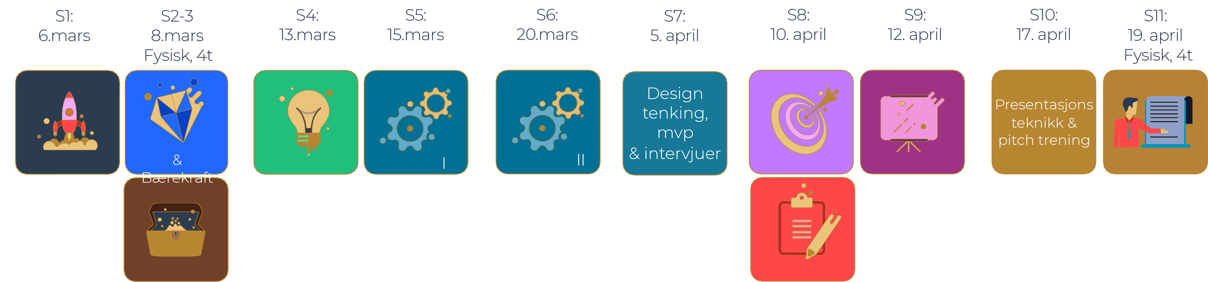 Programmet har plass til 12-14 gründere og går over 5 uker (med opphold i påsken). Se programskisse under. Programmet foregår i hovedsak digitalt, men med 2 fysiske halvdags-samlinger. Totalt vil det være elleve sesjoner fordelt over 10 samlinger, hvor 2 er 4 timers fysiske samlinger og de øvrige er online og hver varer 90 minutter. Samlingene vil være onsdag og fredag klokken 09.00 - 10.30 (13.00 for fysiske). Det vil bli en pause i forbindelse med påske før programmet starter opp igjen, klikk se datoer i boksen til høyre for å få fullstendig oversikt over samlingene. Du kan se innhold og datoer under.